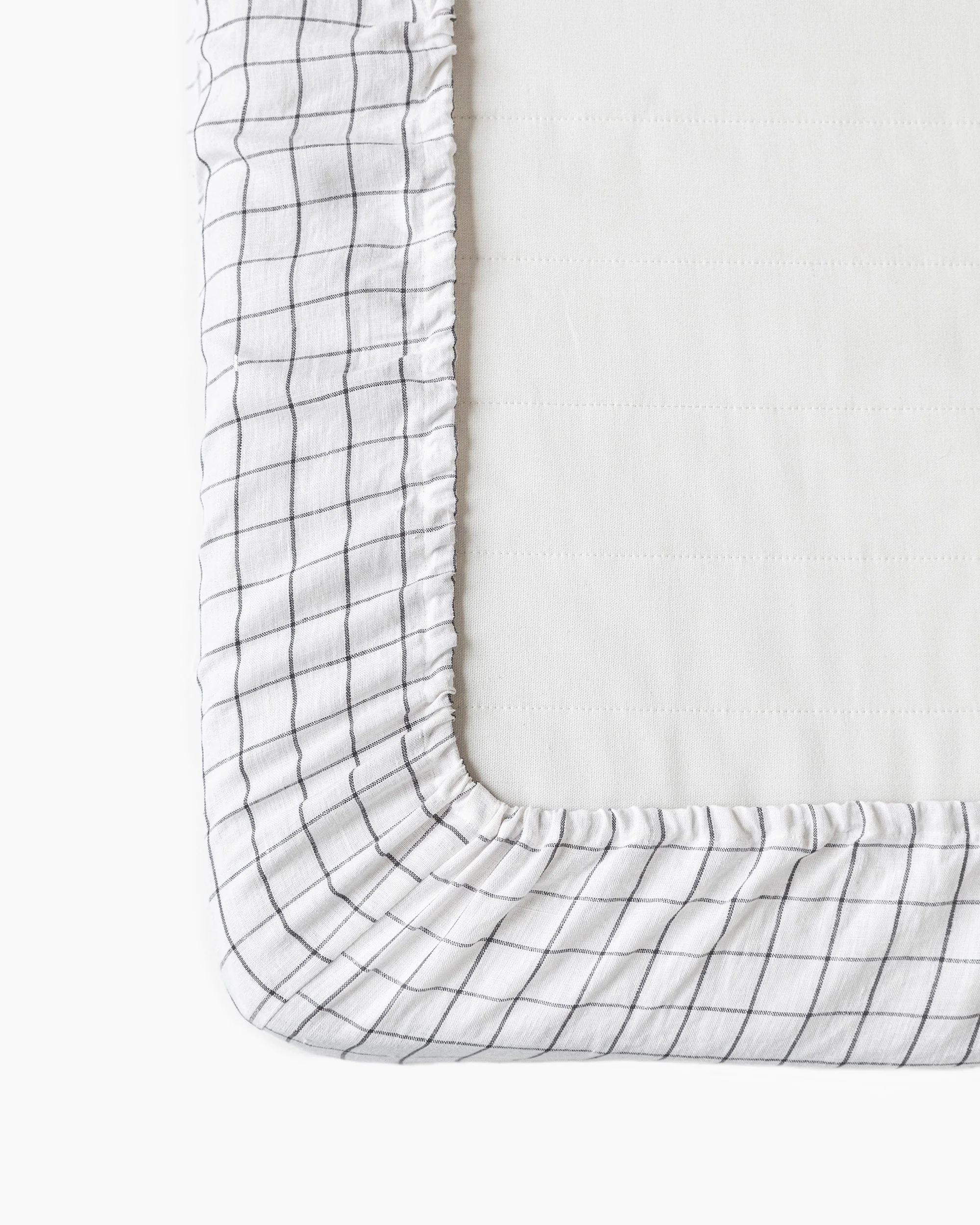 Linen fitted sheet in charcoal grid (windowpane) pattern. Gentle and breathable linen sheets will become a staple of every modern bedroom. The natural thermoregulating and moisture-wicking properties of linen guarantee the feeling of comfort all year round. Fitted sheets have been pre-washed for maximum softness and durability.