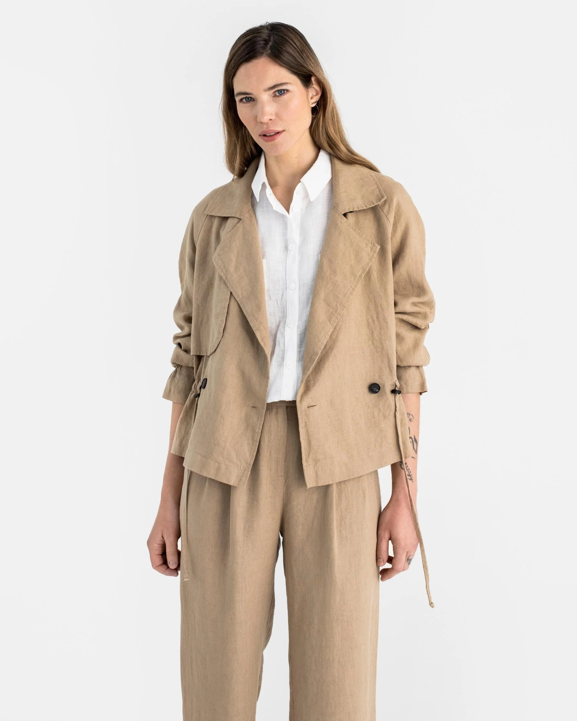 Cropped linen trench coat style jacket, featuring wide front lapels and raglan-type sleeves. The sleeves have partial elastic at the bottom, forming a gathered effect. The jacket flaps can also be fastened up to the neck. The waist circumference is adjustable with an integrated belt, secured by black metal stoppers. Seamlessly blending a stylish and professional aesthetic, this piece is perfect for both sophisticated occasions and everyday wear.