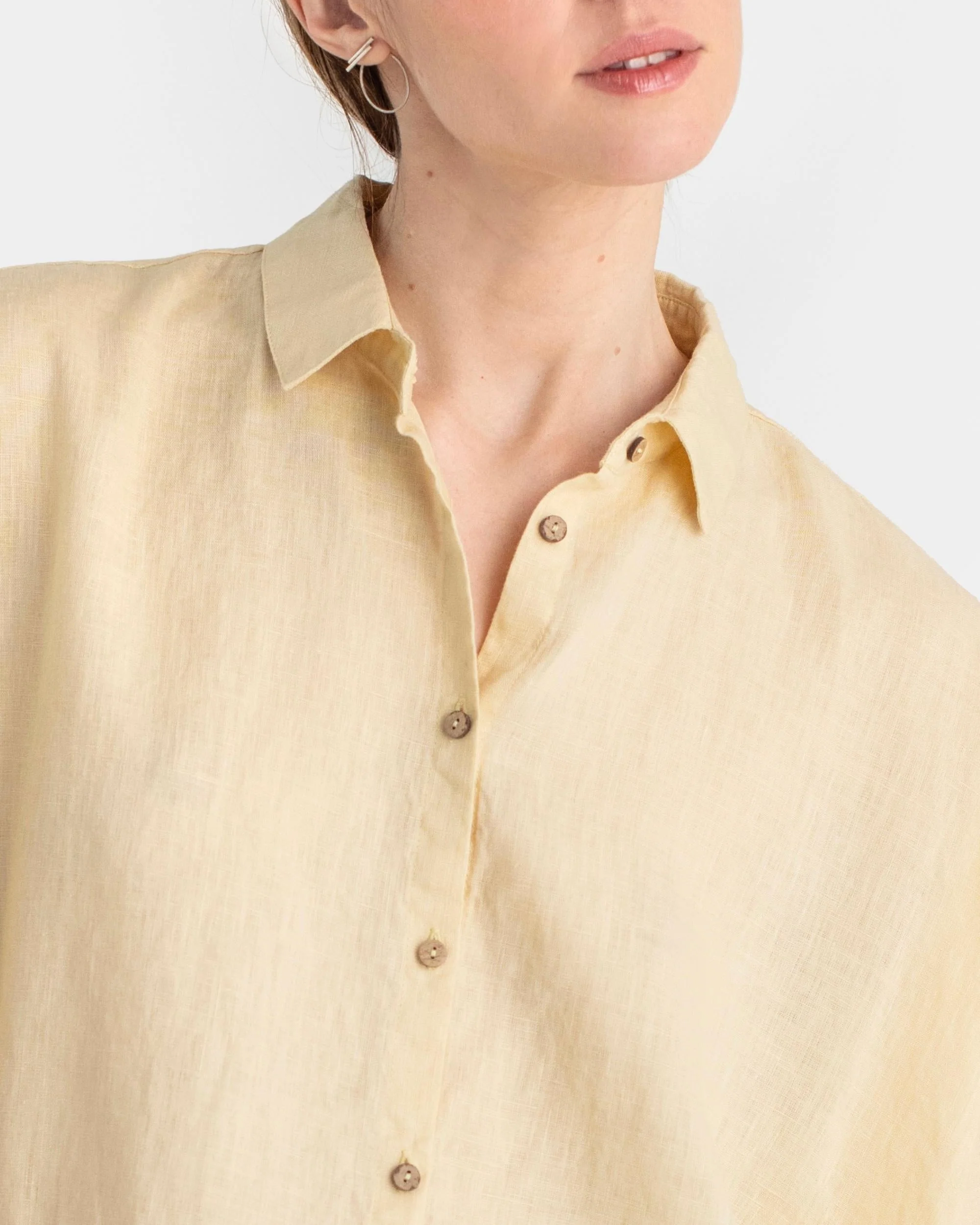Oversized shirt type blouse crafted from lightweight linen. With an asymmetrical hem that's longer at the back, dropped shoulders, and short sleeves, fastened with coconut buttons for a stylish touch. A true wardrobe staple.