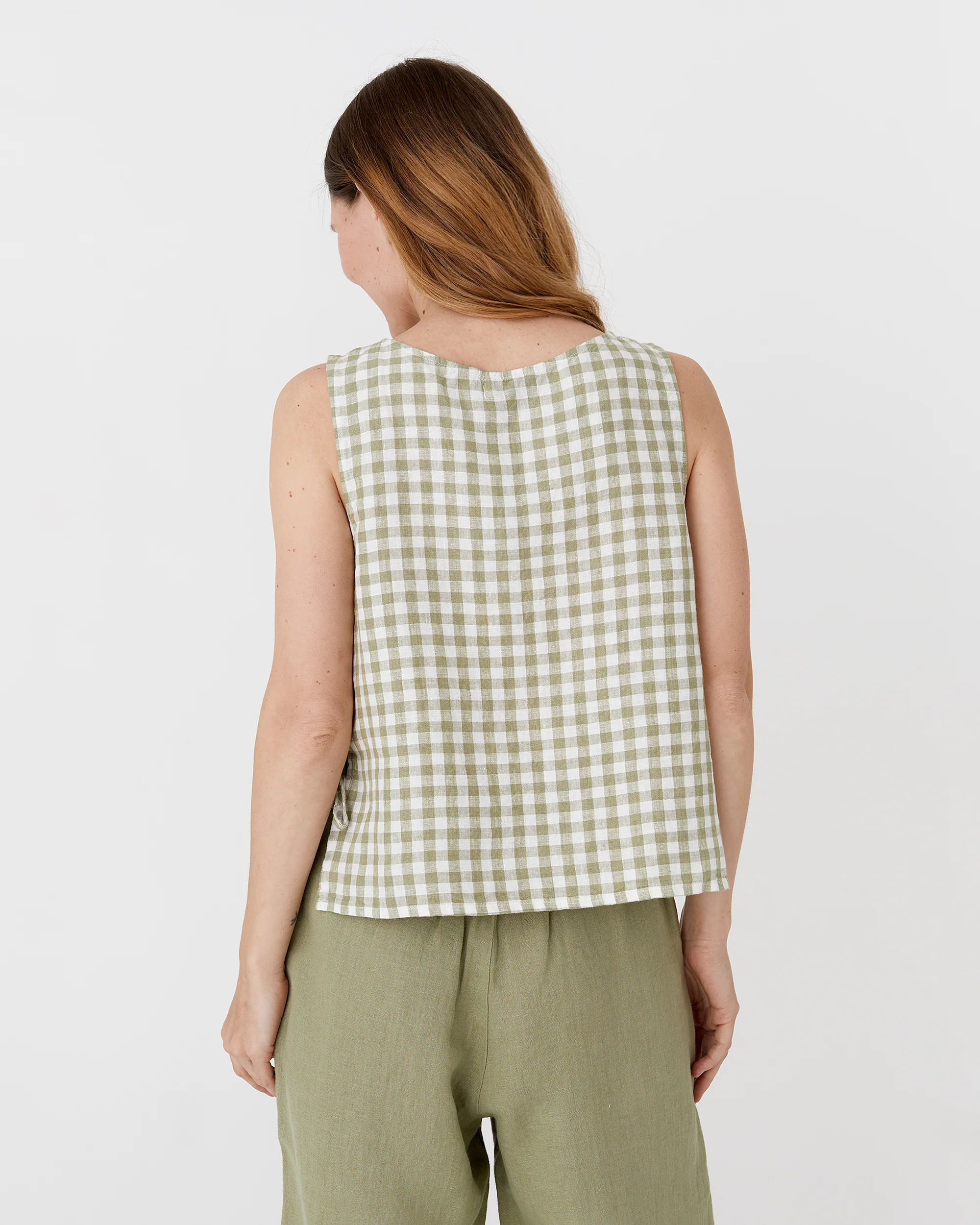 Enjoy effortless style with the LUCERNE linen top in sage gingham. This breezy piece features side ties that create a chic cut-out effect, complementing its sleeveless design and round neckline for a comfortable fit. Perfect for warm weather, this top offers a flattering and versatile addition to any wardrobe.