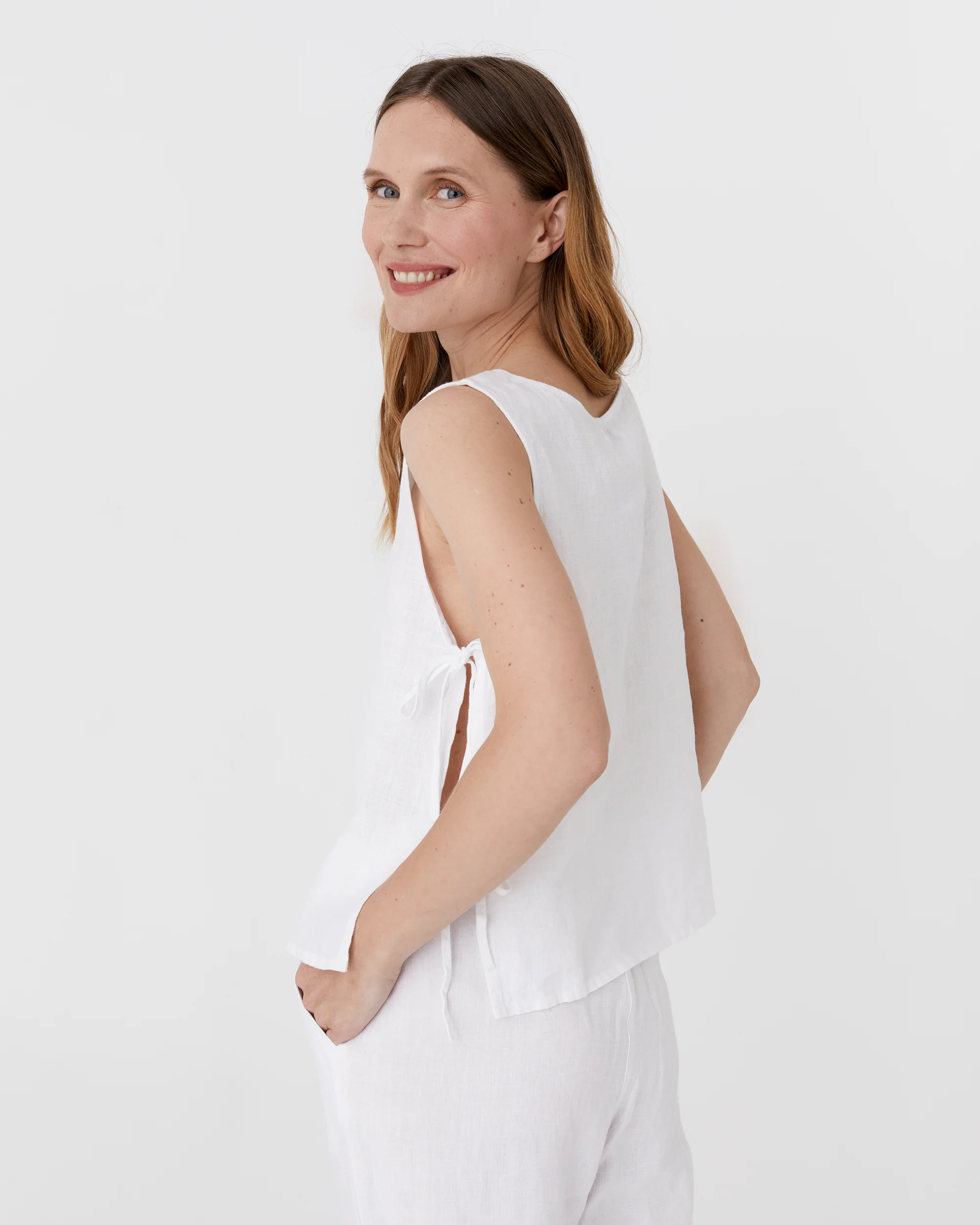 Enjoy effortless style with the LUCERNE linen top in white. This breezy piece features side ties that create a chic cut-out effect, complementing its sleeveless design and round neckline for a comfortable fit. Perfect for warm weather, this top offers a flattering and versatile addition to any wardrobe.