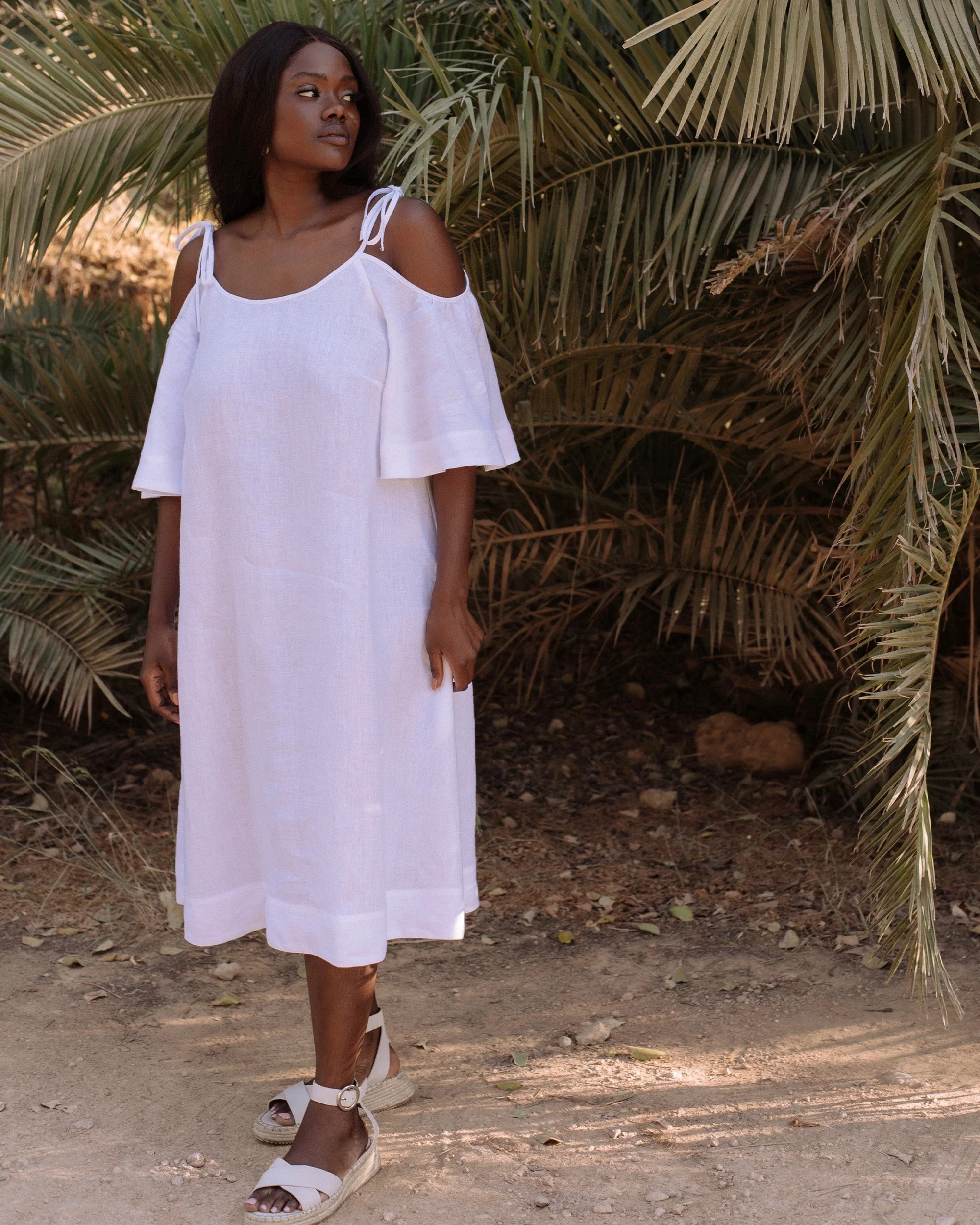 Midi cold shoulder linen dress THASSOS in White